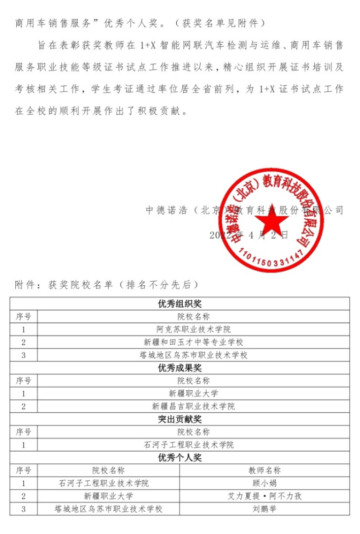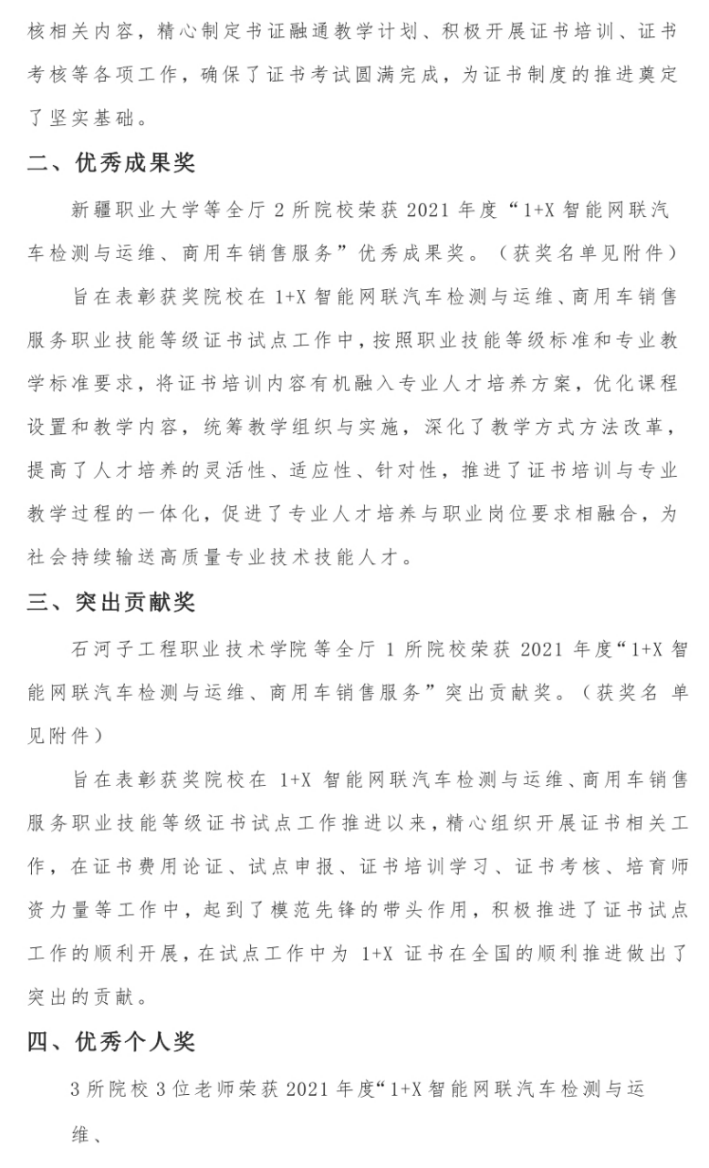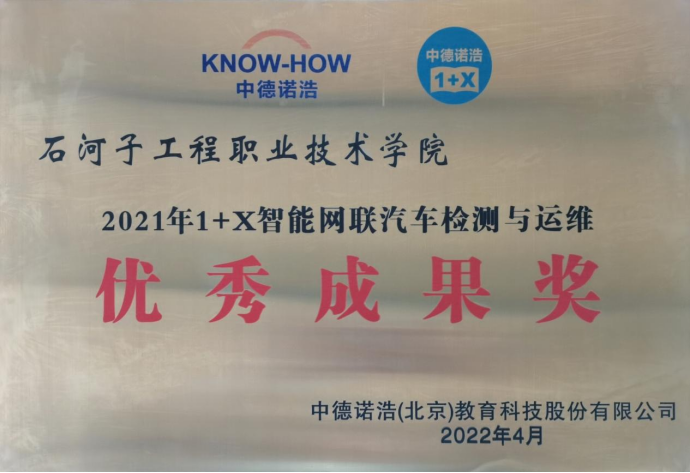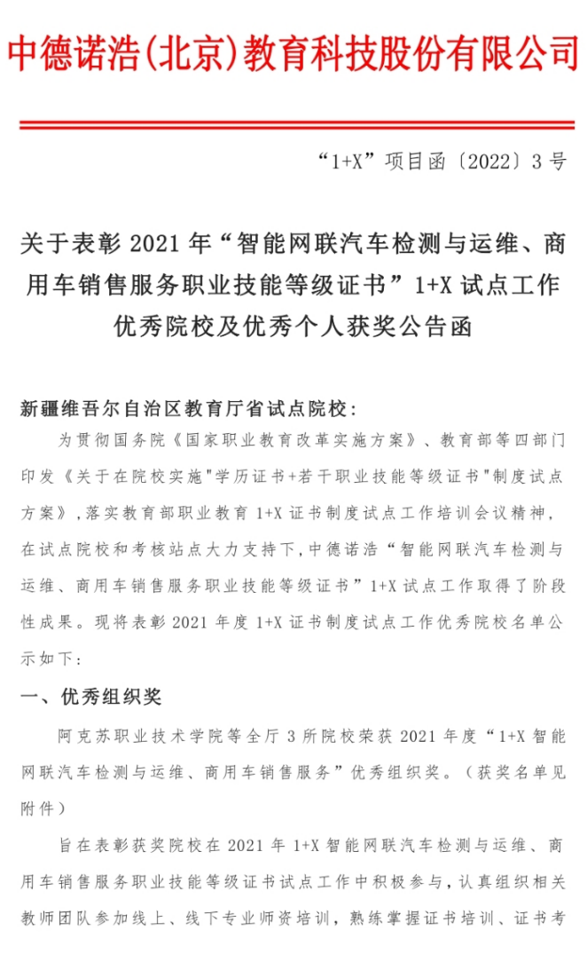 2022年6月14日,中德诺浩(北京)教育科技股份有限公司发布《关于表彰 2021 年“智能网联汽车检测与运维、商 用车销售服务职业技能等级证书”1+X 试点工作 优秀院校及优秀个人获奖公告函》,beat365正版唯一官网荣获“突出贡献奖”、“优秀成果奖”,汽车工程系副主任顾小娟老师荣获“优秀个人奖”。