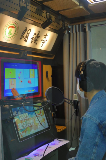 进入图书馆一层,映入眼帘的是沙盘和三个温馨舒适的自习场所。旁边还有能让同学沉浸到阅读乐趣之中的朗读亭,亭内设有专业的隔音设备,自然放松的灯光,为同学搭建起书籍与心灵共鸣的桥梁。