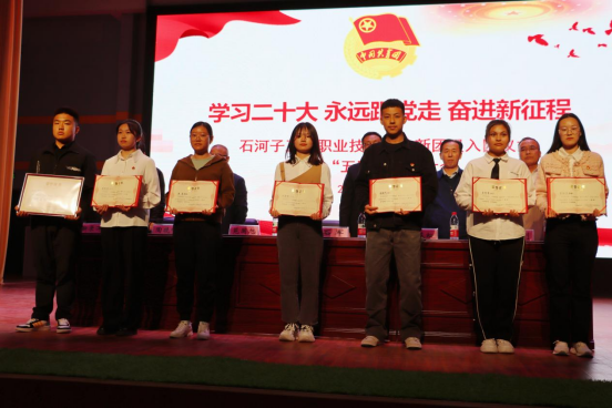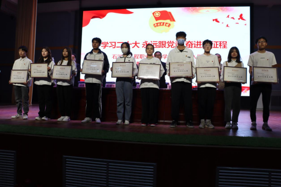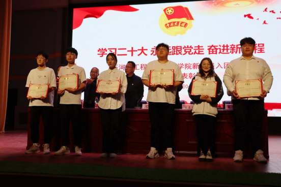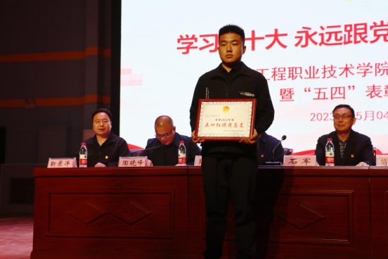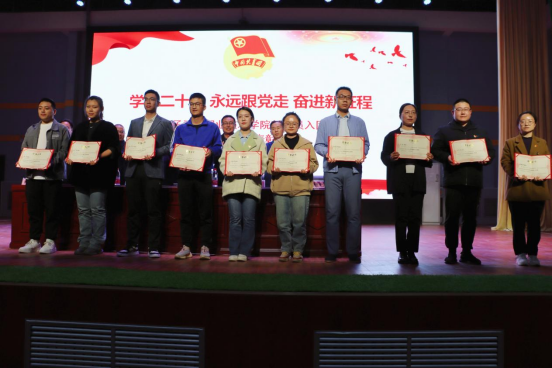 为了充分发挥先进典型示范引领作用,激励广大团组织和团员、团干部踔厉奋发、创先争优,入团仪式结束后进行了表彰环节。由学院纪委简基松书记宣读学院2022年度“优秀共青团员”“优秀共青团干部”“五四红旗团支部”和“五四红旗团总支”名单。学院靳录洋副院长宣读“学习二十大·我爱我的祖国·坚定信念跟党走”主题演讲比赛获奖师生名单。学院工会王胜利主席宣读学院首届“十佳微团课”评选活动获奖师生名单。获奖代表依次上台领奖,与会领导为师生代表颁奖并合影留念。