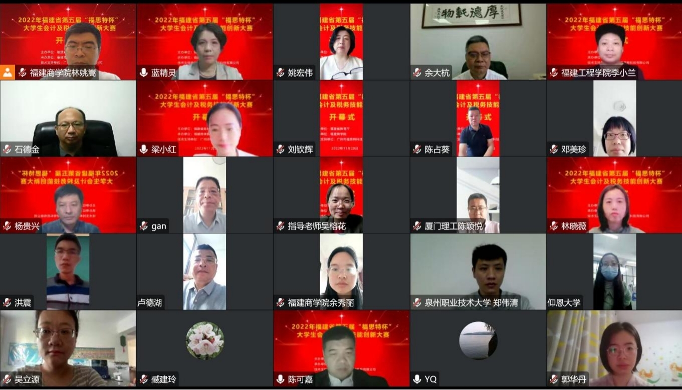 11月20日上午,由福建省教育厅主办,新葡的京集团承办,广州市福思特科技有限公司提供技术支持的福建省第五届“福思特杯”大学生会计及税务技能创新大赛于线上成功举办。大赛组委会成员、技术支持企业负责人以及来自全省30多所高校的经管类学科专业负责人参加了开幕式,校长程灵在开幕式上致辞。全省27所本科高校94支代表队和9所高职院校22支代表队,近400名学生参赛。