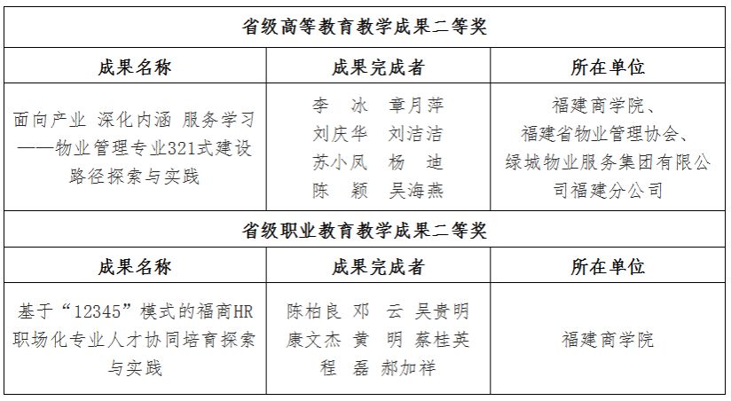 近日,省教育厅公布了2022年省级教学成果奖获奖名单,新葡的京集团工商管理学院李冰老师牵头申报的《面向产业 深化内涵 服务学习——物业管理专业321式建设路径探索与实践》荣获省级高等教育教学成果二等奖,陈柏良老师牵头申报的《基于“12345”模式的福商HR职场化专业人才协同培育探索与实践》荣获省级职业教育教学成果二等奖。