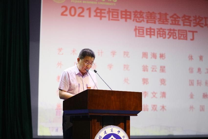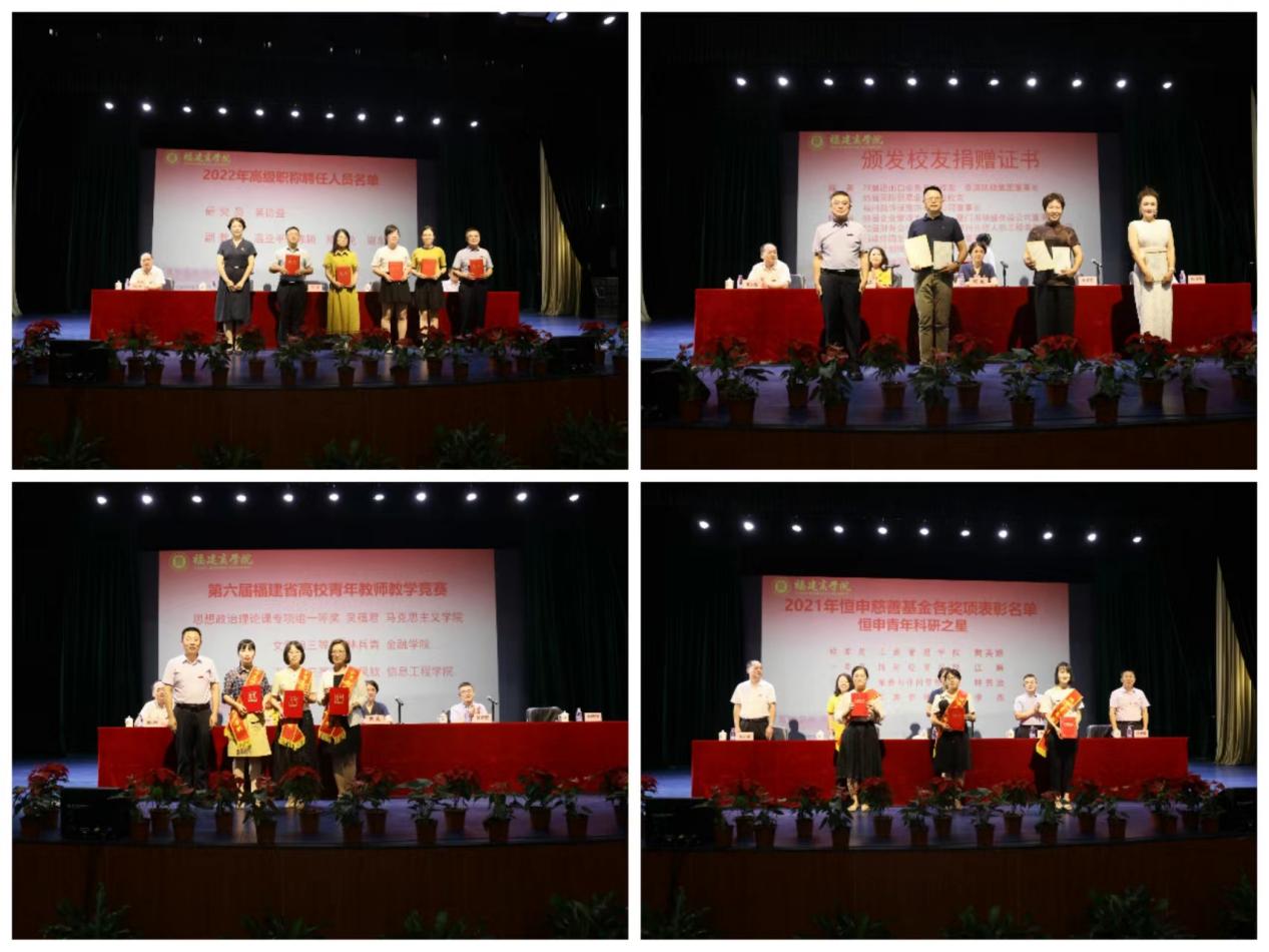 校党委副书记吴访益宣读了《新葡的京集团350vip8888首页校友奖教金2022学年度项目设置方案》,并为慷慨捐赠奖教金的校友代表陈英、何丽玉、陈全福、林健全、陈学一颁发捐赠证书和感谢信。校党委副书记徐晓丹宣读了2022年高级职称聘任人员名单。副校长杨晓翔宣读了2021-2022学年度在教育教学、学科竞赛、科研立项等方面取得的重要成果和2021年度恒申慈善基金各奖项获奖者名单。校领导分别为获奖教师代表颁奖。