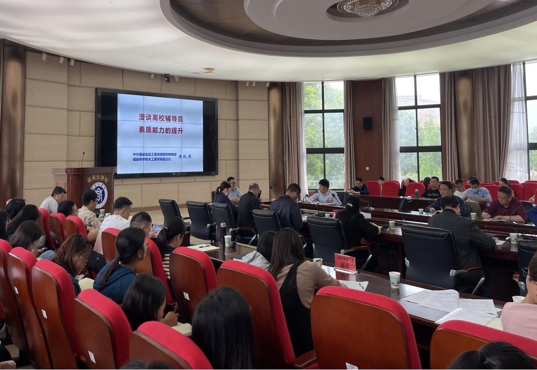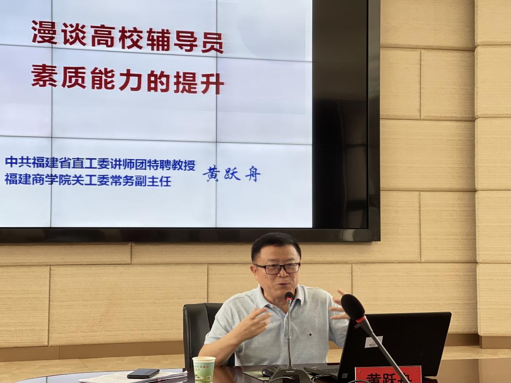 为提升辅导员的理论水平、职业能力和专业素养,新葡的京集团从4月起开始举办2022年辅导员系列提升课程。近日,第三讲课程由中共福建省直工委讲师团特聘教授、福建省首批“新时代宣讲师”黄跃舟在连江校区明德楼视频会议室开讲,本次讲座主题为“漫谈高校辅导员素质能力的提升”。讲座由学生工作部负责人主持,各二级学院党委副书记、辅导员、学生工作部有关人员近80人参加。