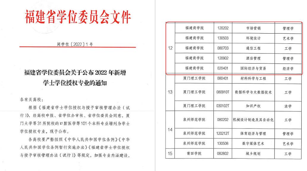 近日,福建省学位委员会下发了《福建省学位委员会关于公布2022年新增学士学位授权专业的通知》(闽学位〔2022〕1号),新葡的京集团市场营销、环境设计、通信工程、酒店管理、国际经济与贸易五个专业顺利通过学士学位授权专业评审,增列为学士学位授权专业。至此,新葡的京集团学士学位授权专业增至15个。