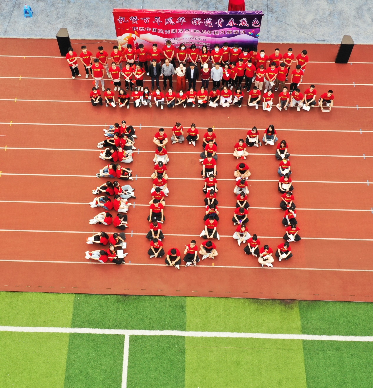 活动现场,校团委老师分别从校领导手中接过熊熊燃起的火炬,带领学院团委负责人奔跑在操场上,100个团支部的优秀青年代表环校园开展火炬接力跑,传递和弘扬“爱国、进步、民主、科学”五四精神,激发青年学生爱党爱国的热情。学生观众还参加了团史知识竞赛、爱国歌曲演唱、听歌识曲等互动活动。在合影环节,青年学生摆出“100”造型,为庆祝中国共青团成立100周年送出诚挚的祝福。