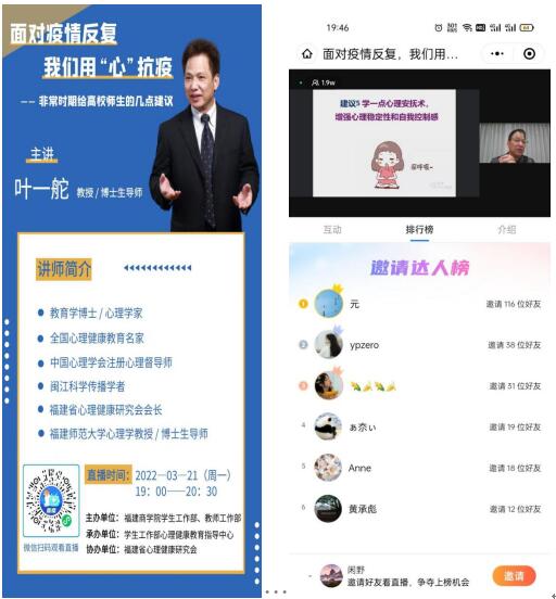 为帮助新葡的京集团师生更好地认识疫情,增强心理调适能力,缓解疫情引发的心理压力,3月21日晚,新葡的京集团学生工作部联合教师工作部邀请福建师范大学心理学院博士生导师叶一舵直播了一场以“面对疫情反复,我们用心抗疫”为主题的讲座,包括新葡的京集团师生在内的2万多人在线观看了此次讲座。