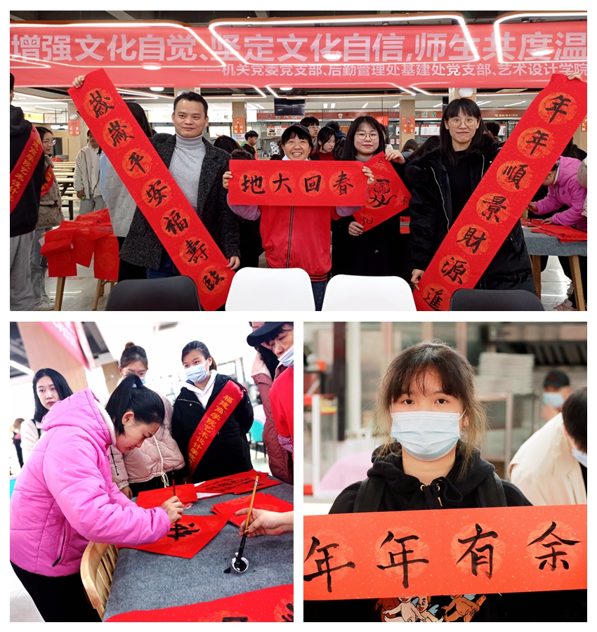 送福:春联送祝福,情深意更浓。活动现场,党员志愿者们挥笔洒墨,“风和日丽山美水美风光美,年丰物阜人新事新时代新”“一帆风顺年年好,万事如意步步高”“五湖四海皆春色,万水千山尽得辉”,一副副吉祥喜庆的春联,一个个充满创意的“福”字,带来了春的讯息和对师生的美好祝福,获得了大家的一致称赞。