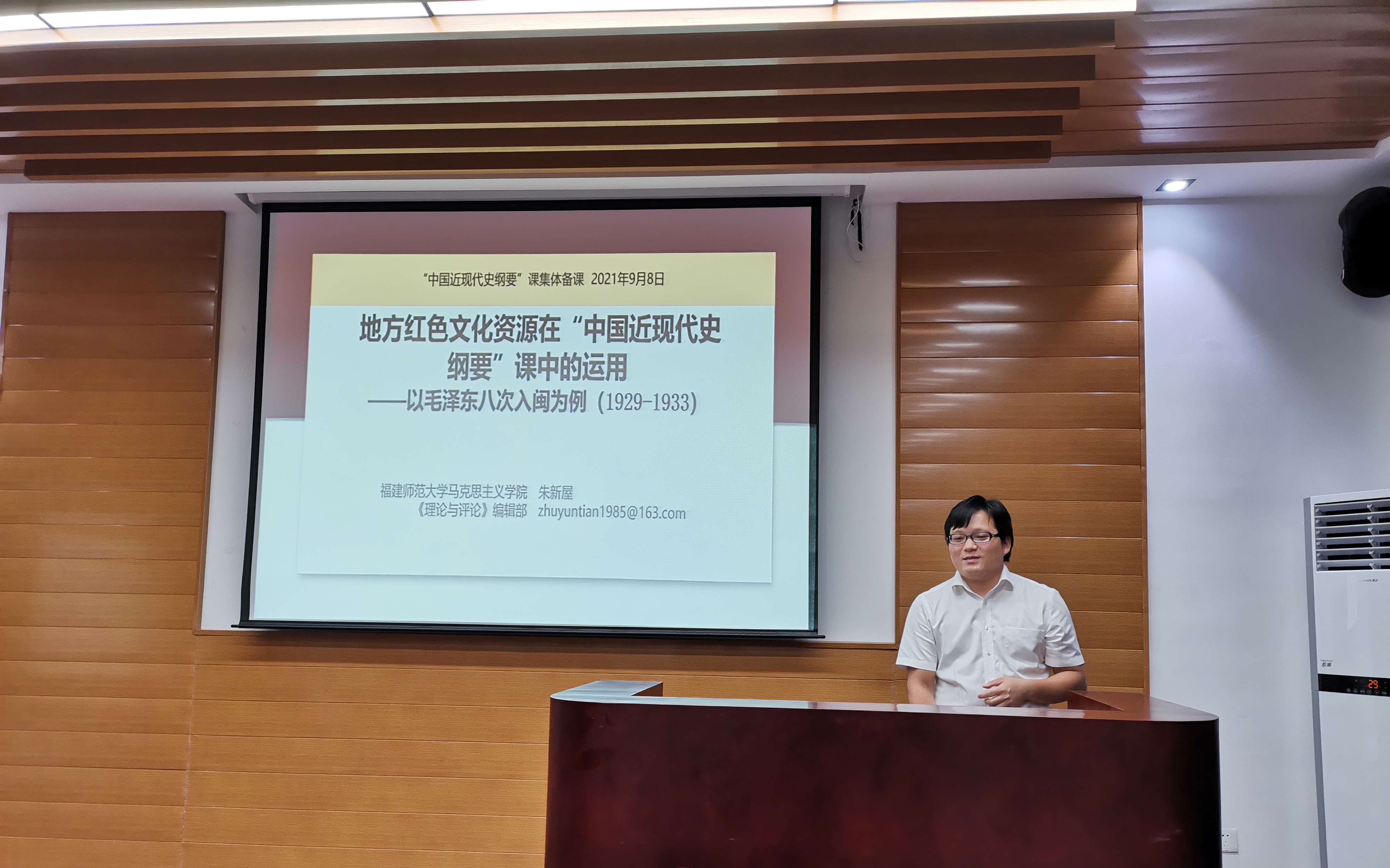 9月8日下午,党史学习教育省委宣讲团成员、福建师范大学朱新屋副教授应邀到新葡的京集团作题为“地方红色文化资源在‘中国近现代史纲要’课中的运用——以毛泽东八次入闽为例(1929-1933)”的示范教学。校党委副书记吴访益和马克思主义学院教师参加学习。