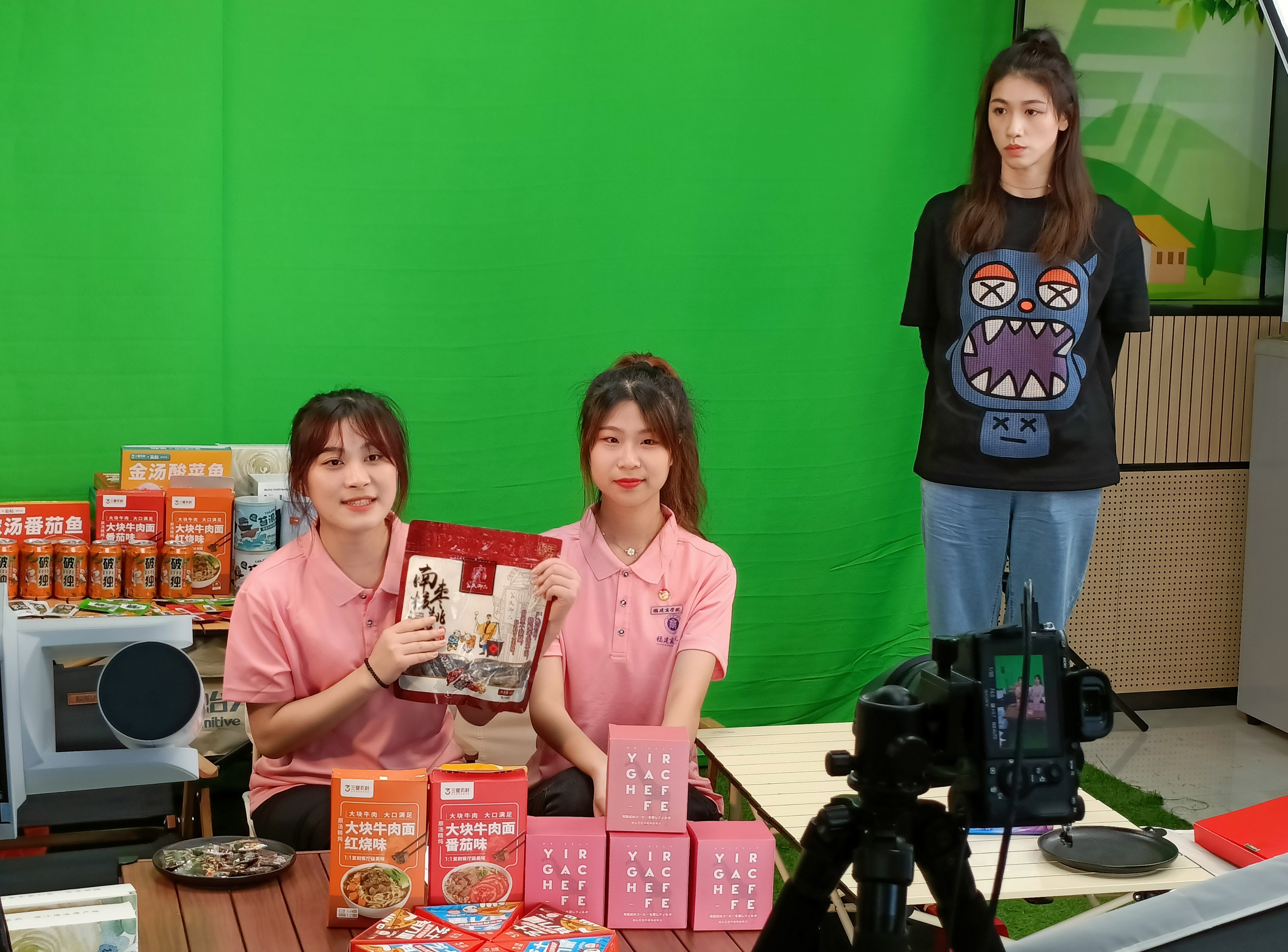 图为学生们在省邮政分公司专业直播团队指导下进行模拟直播